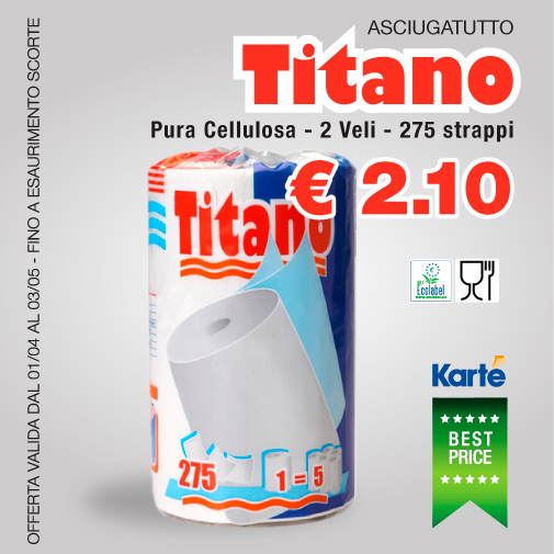 Realizzato in pura ovatta cellulosa con pretaglio così da facilitare volta lo strappo, certificato Ecolabel e idoneo al contatto Alimentare. Il rotolo lungo ben 72 mt, ed equivale a 5 dei normali rotoli. Il rotolo di carta assorbente Titano è stato creato con doppio velo appositamente per avere un maggiore assorbimento e quindi ridurre gli sprechi.
