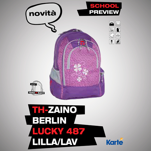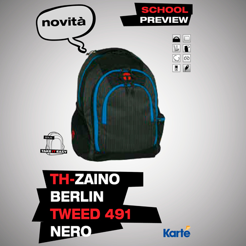 Preview Scuola Karté 2015/2016 | Zaini Take It Easy mod.BERLIN: due scomparti organizzati e pratici, il più grande per riporre libri e quaderni, l'altro per riporre penne, astuccio, tablet, chiavi o occhiali;ogni zaino è dotato di una tasca elastica per riporre una bottiglia o una borraccia. L'imbottitura ergonomica dello schienale e le fasce frontali garantiscono una perfetta vestibilità e massima funzionalità rendendo lo zaino il compagno ideale per la scuola ed il tempo libero. Misure: B: 32 cm x H: 48 cm x P: 22 cm Volume: 26 litri