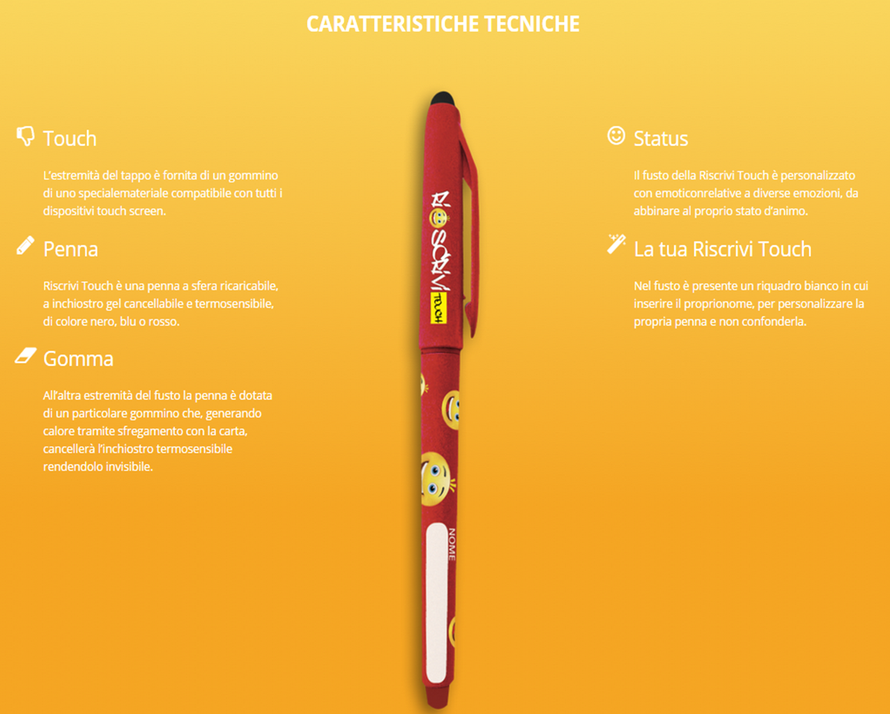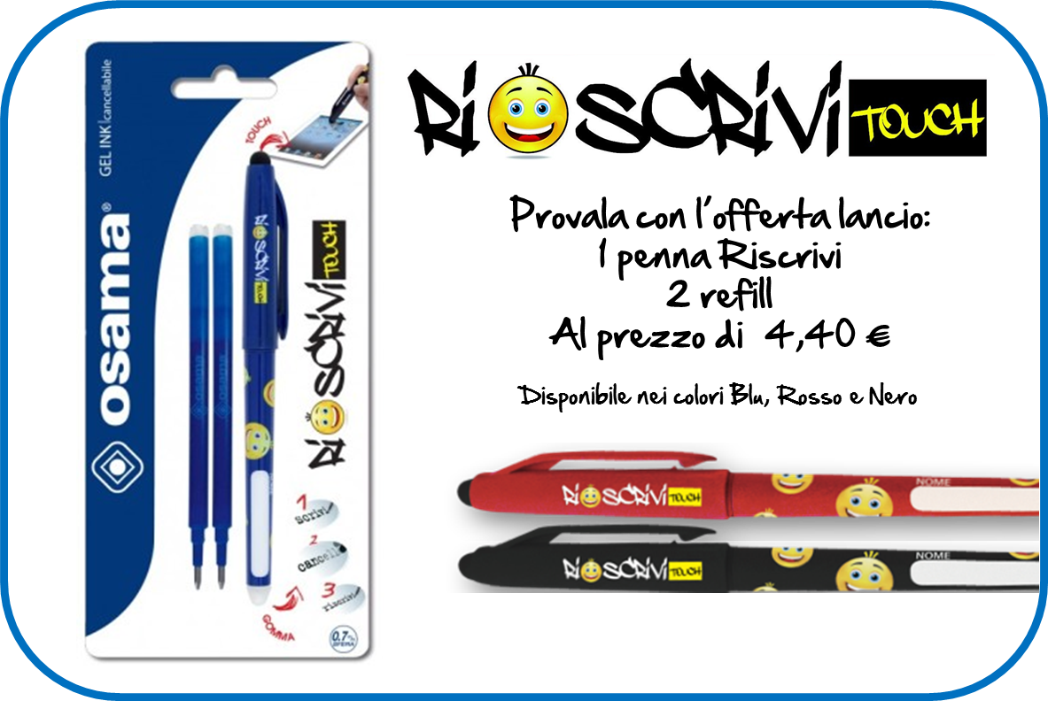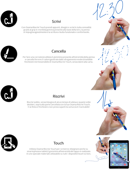 Osama Riscrivi Touch è l’unica penna a sfera a inchiostro cancellabile che permette di scrivere sia su carta che su supporto digitale senza dover cambiare penna: oltre a scrivere, cancellare e riscrivere su qualsiasi supporto cartaceo, la nuova penna di Osama è anche stylus pen utilizzabile su qualsiasi smarphone e tablet.