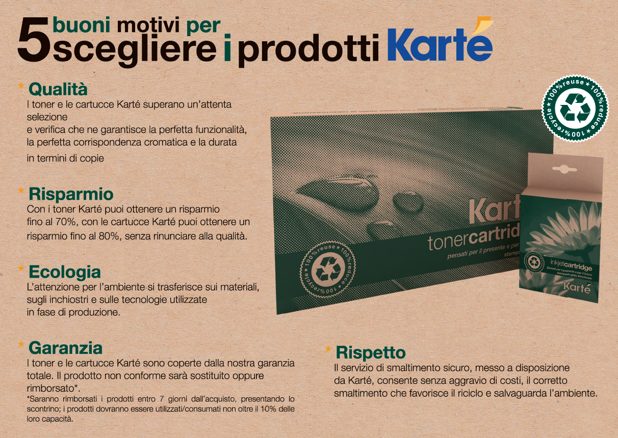 - Qualità >> le cartucce rigenerate e compatibili a marchio Karté sono garantite da un rigoroso test di qualità che filtra sul mercato solo i pezzi certificati.