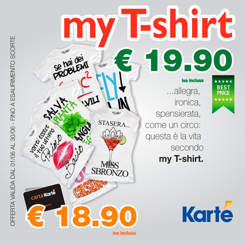 La promozione è valida fino dal 1° al 30 Giugno 2015, fino ad esaurimento scorte. Offerta valida nei punti vendita diKarté Lucca e Karté Viareggio #bestprice #karté #mytshirt #Lucca #viareggio #lifeisacircus #collezionepe2015#allegra #ironica #spensierata #cartaKarté