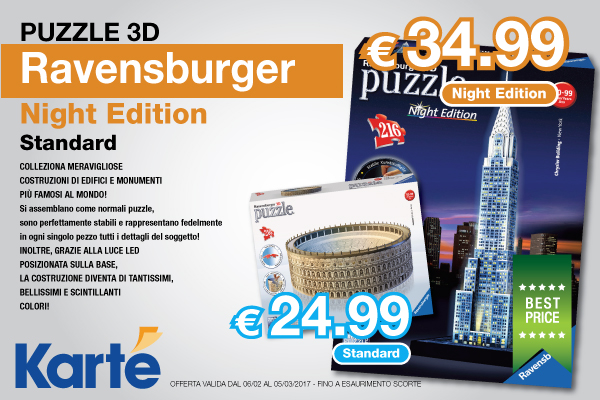 Approfitta dell'offerta del mese! Ravensburger Puzzle 3D Standard e Night Edition Offerta Valida dal 04/02 al 05/03 Scopri L'Incastro Perfetto! I Puzzle Ravensburger 3D sono tagliati in pezzi unici in plastica che si incastrano perfettamente senza l'uso di colla! Ogni pezzo è numerato al suo interno in modo da ricreare, incastro dopo incastro, un monumento dalla struttura unica e indistruttibile. Scegli la Night Edition abbiamo unito a tutto il divertimento di completare il tuo puzzle 3D® un'incredibile funzione di light-up che cambia automaticamente colore
